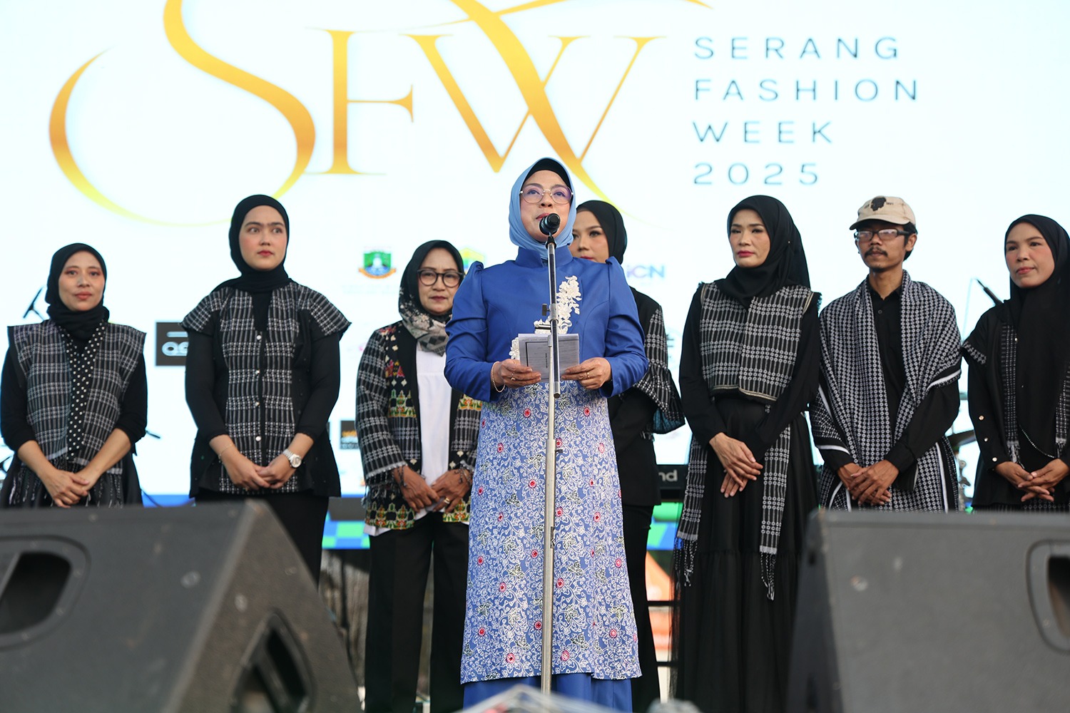 Ketua Dewan Kerajinan Nasional Daerah yang juga Ketua Tim Penggerak Pemberdayaan dan Kesejahteraan Keluarga (TP PKK) Provinsi Banten Tinawati Andra Soni membuka Serang Fashion Week (SFW) 2025 di Kawasan Stadion Maulana Yusuf, Jenderal Sudirman, Ciceri, Kota Serang, Sabtu (9/8/2025). SFW Tahun 2025 merupakan rangkaian HUT ke-18 Kota Serang dan HUT Kemerdekaan RI ke- 80.