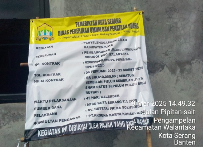 Saya sangat mendukung pembangunan dikota serang dari pemerintah kota serang yang bersumber dari hasil pajak yang masyarakat bayar tapi jangan main main dengan anggaran yang bersumber dari hasil pajak yang masyarakat bayar, kecuali anggaranya dari kantong pribadi silahkan saja dikerjakan asal jadi walaupun tidak bertahan lama, jangan sampai ada percobaan korupsi di proyek pemerintah kota serang tersebut.