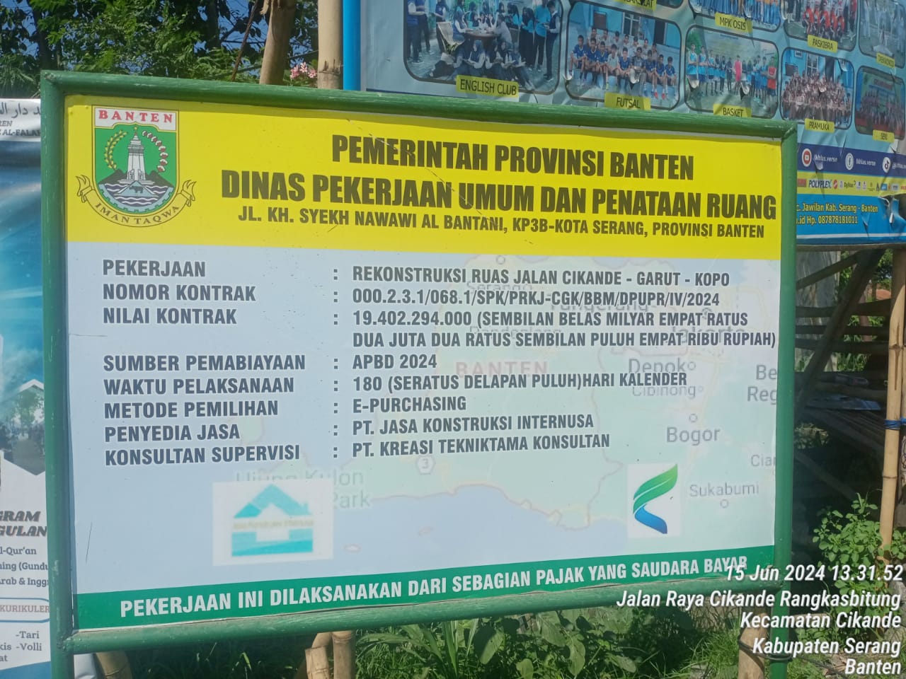 Untuk diketahui, pemerintah Provinsi Banten melalui Dinas Pekerjaan Umum dan Penataan Ruang (DPUPR) sedang melaksanakan pembangunan jalan, salah satunya pada pekerjaan rekontruksi ruas Jalan Cikande – Garut – Kopo dengan nomor kontrak 000.2.3.1/068.1/SPK/PRKJ-CGK/BBM/DPUPR/IV/2024 nilai anggaran