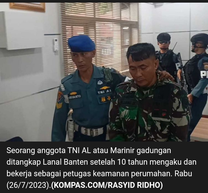 CILEGON, Suara -Rakyat. ID-UH, yang mengaku sebagai anggota TNI AL, Warga kota Serang Banten dicokok oleh petugas TNI AL Lanal Banten. Dikutip dari KOMPAS.com – Selain mengaku sebagai Marinir TNI AL, UH, warga sipil asal Serang, Banten, yang ditangkap petugas Pangkalan TNI AL (Lanal) Banten, juga diduga mengaku sebagai tenaga kesehatan ke masyarakat. Dugaan itu diperkuat saat petugas Lanal Banten menemukan alat kesehatan dan obat-obatan saat menangkap UH di Kecamatan Cipocok Jaya, Kota Serang, Rabu (26/7/2023) dini hari. Anggota Marinir Gadungan Ditangkap, Ternyata 10 Tahun Bekerja sebagai Satpam Perumahan.